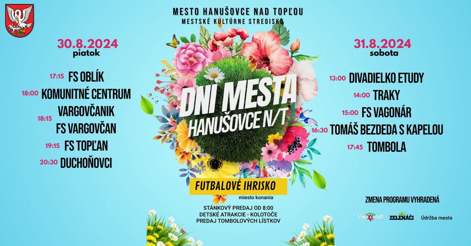 Mesto Hanušovce nad Topľou a Mestské kultúrne stredisko mesta Hanušovce nad Topľou Vás pozývajú na Dni mesta 2024, ktoré sa uskutočnia dňa 30. - 31. 08. 2024.