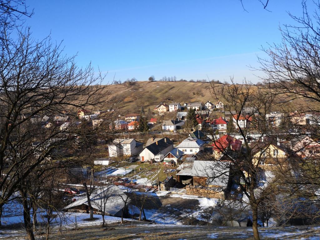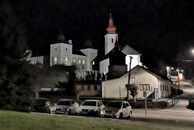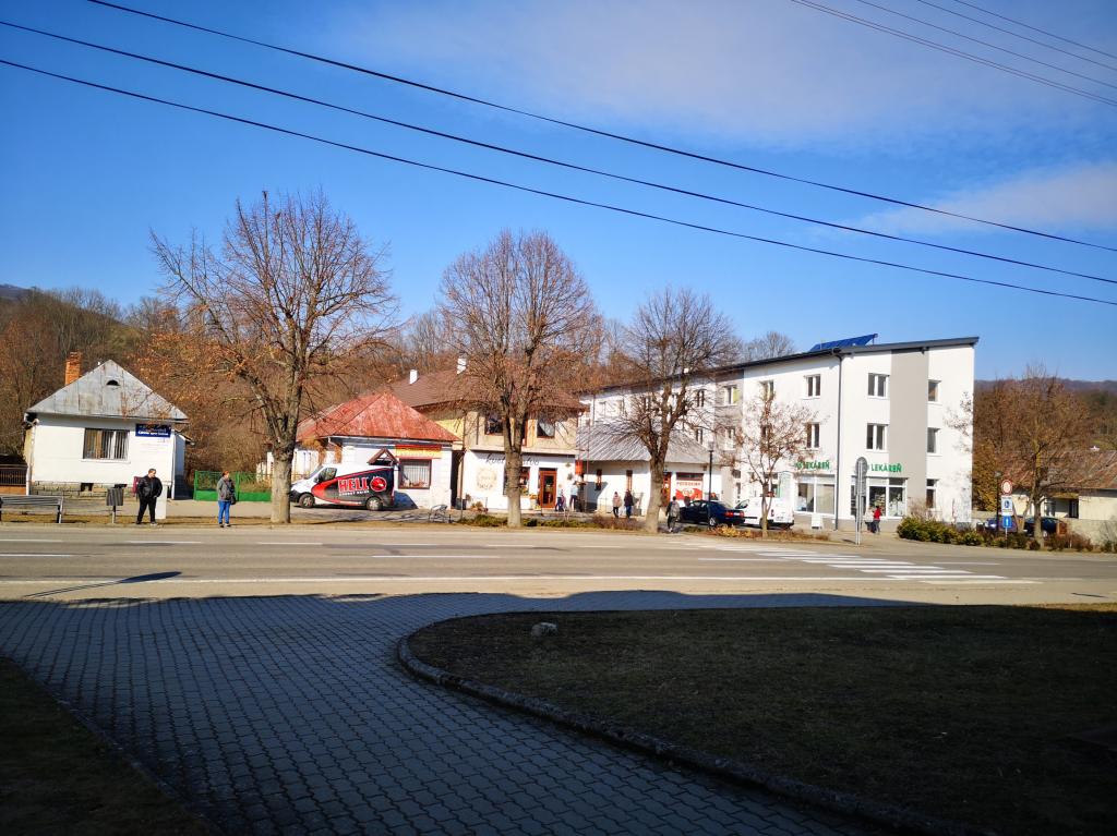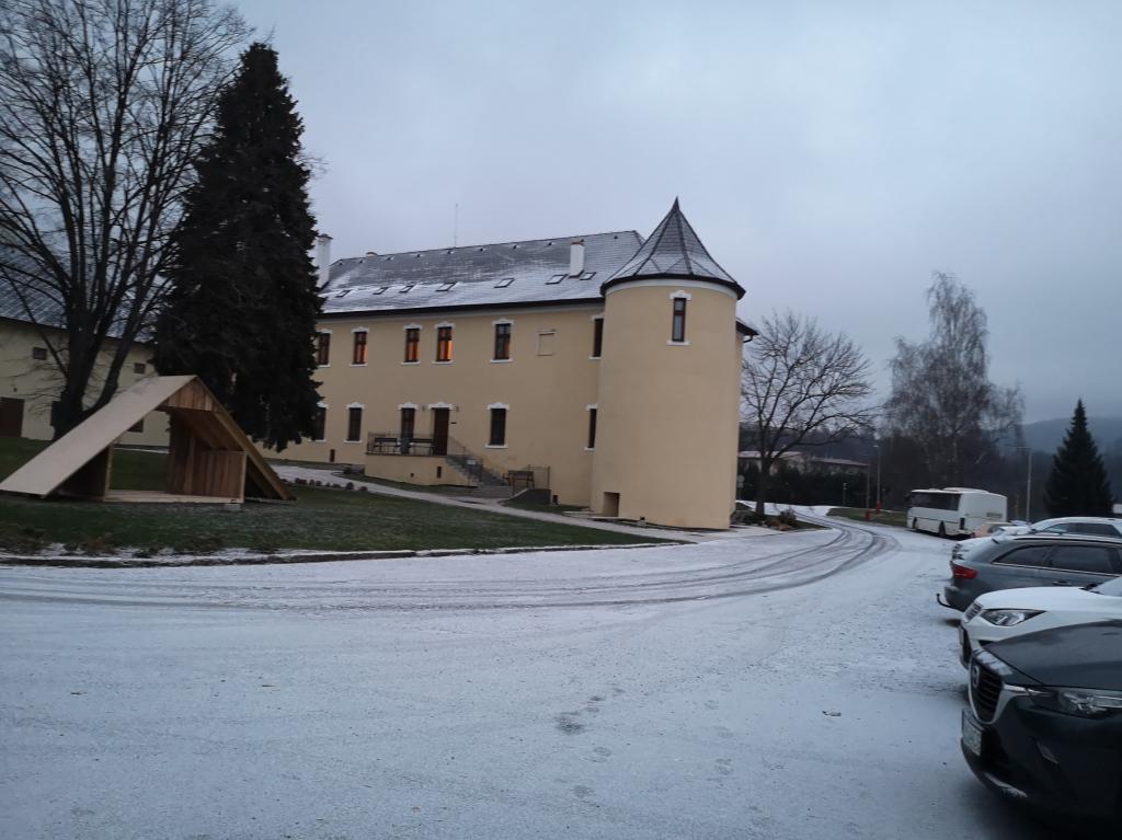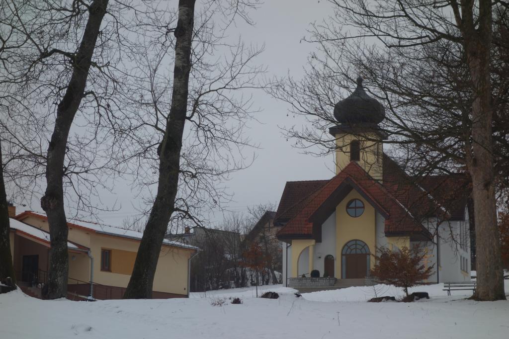 Snehu nebolo veľa, ale sneh bol. Gréckokatolícky kostol a fara, fasáda Veľkého kaštieľa pred ukončením rekonštrukcie i kultúrny dom.