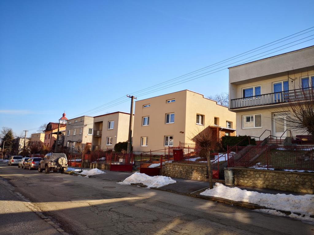 V pozadí za ihriskom zrekonštruovaný bytový dom pri rímskokatolíckej fare.