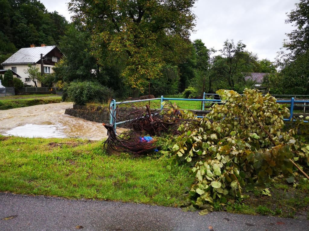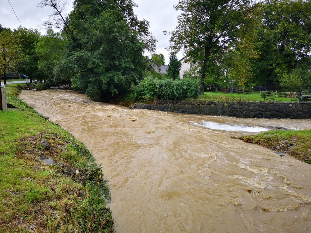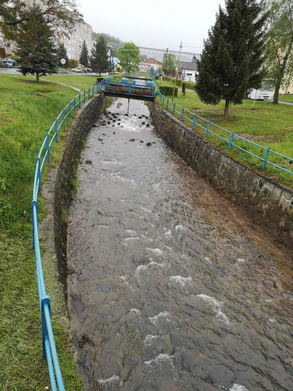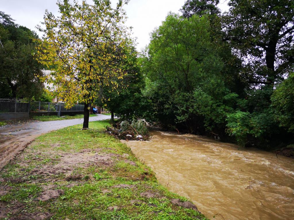 Kláštorná ulica: 14. augusta 2019 hrozilo ráno vyliatie vody z koryta Hanušovského potoka. Zábery sú z popoludnia, keď voda v potoku už upadla.