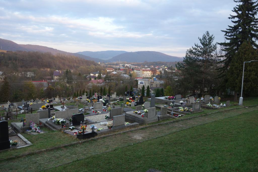 Veľká noc, veľká paska a svätenie jedál na dvore pri rímskokatolíckom kostole; odtiaľ vidno hanušovskú sídliskovú zónu.