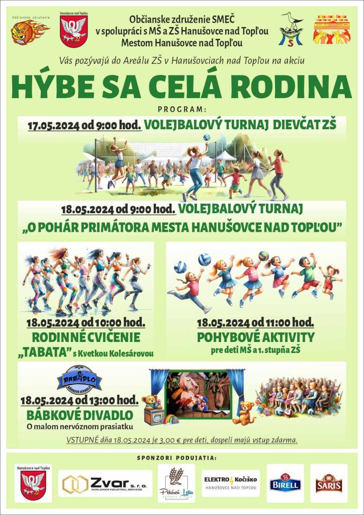OZ Smeč v spolupráci s MŠ, ZŠ a mestom Hanušovce nad Topľou Vás pozývajú do areálu ZŠ v Hanušovciach nad Topľou na akciu Hýbe sa celá rodina, ktorá sa uskutoční 17. a 18. 05. 2024.