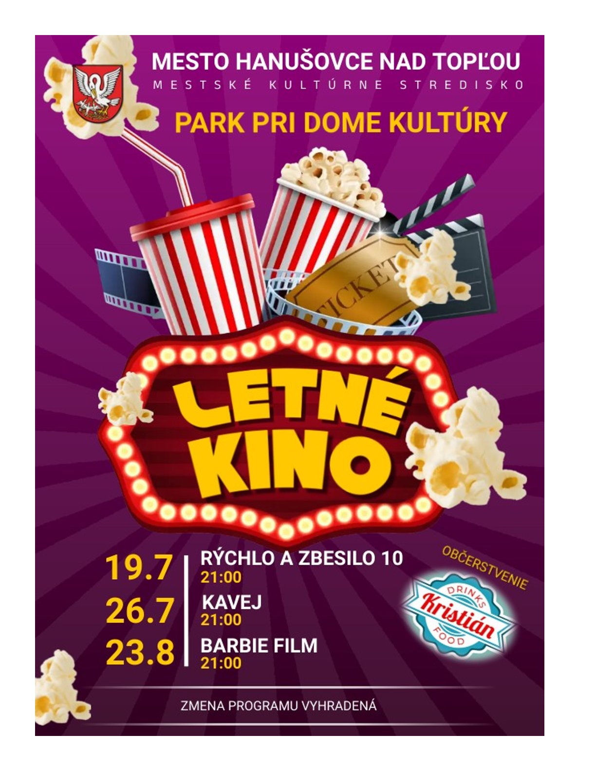 Mesto Hanušovce nad Topľou a MsKS Vás pozývajú na Letné kino,