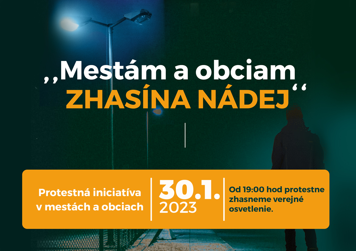 Vážení obyvatelia, pripájame sa k celoslovenskej iniciatíve „Mestám a obciam zhasína nádej,“ podľa ktorej dňa 30. januára 2023, v čase od 19:00 hod. do 19:30 hod. demonštratívne zhasneme časť verejného osvetlenia.
