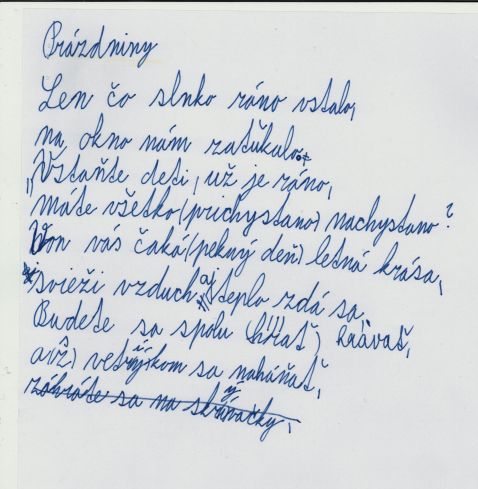 Druhá úloha sa týkala konkrétnej témy. Deti lósovali jednu z nasledovných tém - prázdniny, hra, leto, voda, večer.