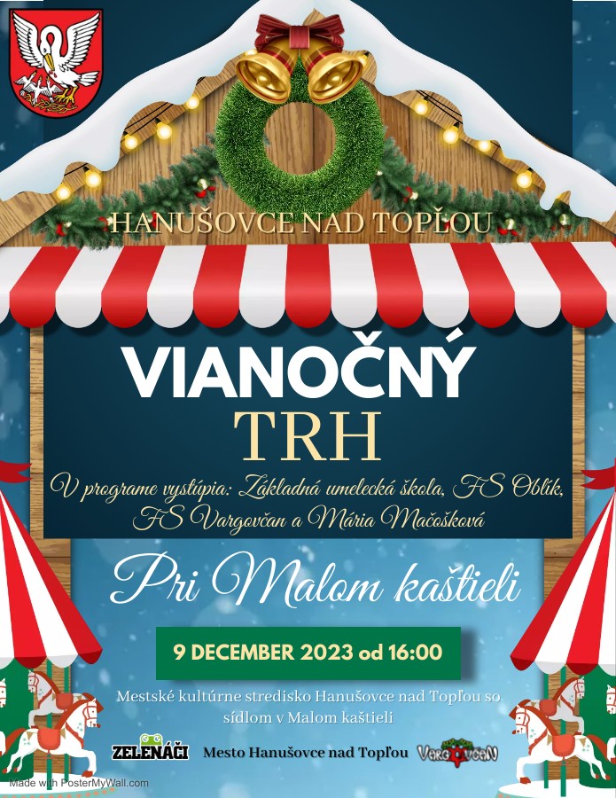 MsKS, Mesto Hanušovce nad Topľou, Zelenáči, FS Vargovčan Vás pozývajú na Vianočný trh, ktorý sa uskutoční pri Šóšovskom (Malom) kaštieli dňa 09. 12. 2023 od 16:00 hod.