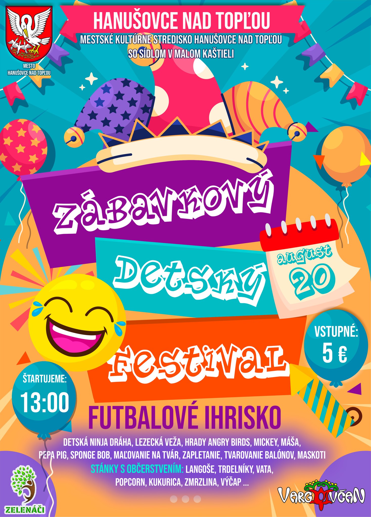 Mesto Hanušovce nad Topľou, MsKS mesta Hanušovce nad Topľou, Zelenáči a Vargovčan vás pozývajú na detský festival v súčinnosti s firmou Zábavka, ktorý sa uskutoční dňa 20. augusta 2023, t. j. v nedeľu na futbalovom ihrisku v Hanušovciach nad Topľou so začiatkom o 13:00 hod.
